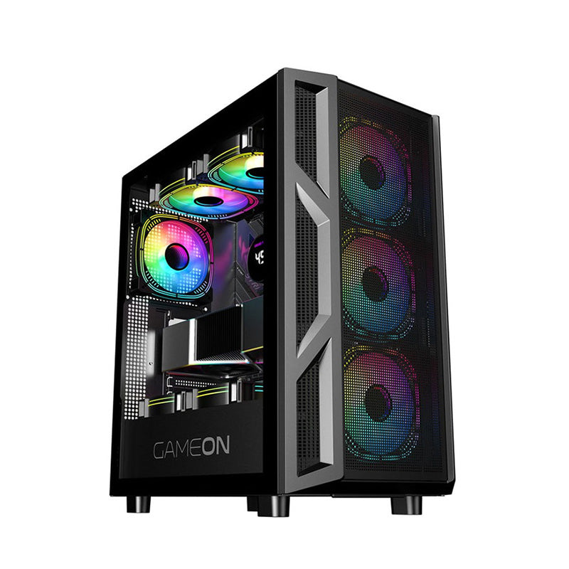 العلبة: علبة ألعاب GAMEON TRIDENT IV ARGB ATX متوسطة الحجم باللون الأسود مع 4 مراوح ARGB.