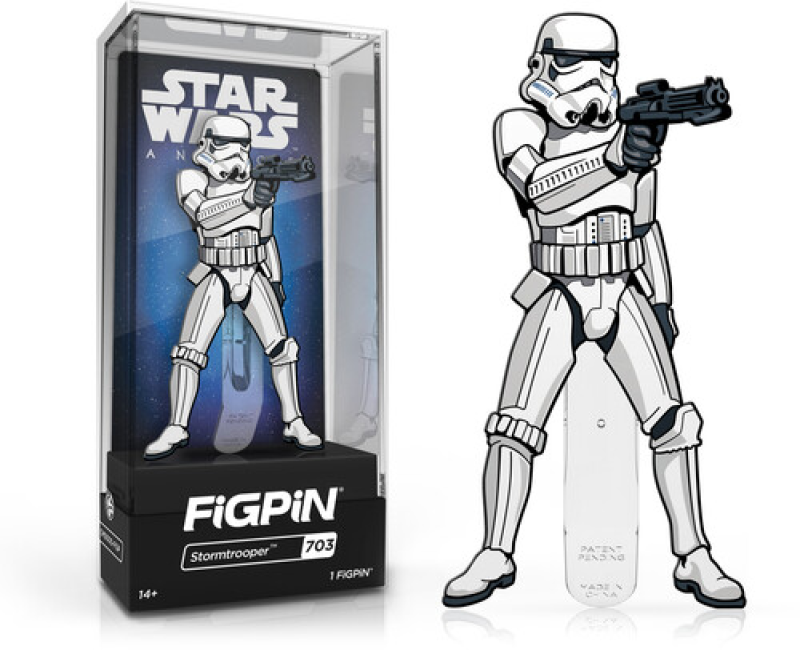 From the epic 1977 film Star Wars: A New Hope comes this Stormtrooper 3-inch FiGPiN Classic Enamel Pin. This FiGPiN Classic 3-inch enamel pin features an Imperial Stormtrooper taking aim with a blaster rifle and is #703 in the collection. The premium hard enamel 3-inch tall FiGPiN is amazingly detailed and is able to stand up with the signature FiGPiN rubber backer stand. The pin comes displayed in front of a backer card and is fully capsulated in the ultra collectible FiGPiN clear protector case.