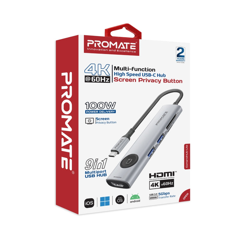 ComandHub-Lite sets a new standard in connectivity solutions. This 9-in-1 USB-C hub features an innovative HDMI Privacy Button for instant screen-off capability, dual 5Gbps USB-C and USB-A ports for high-speed data transfers, and a 100W USB-C Power Delivery Port for efficient device charging. Enjoy 4K@60Hz HDMI output and expand your storage with SD/TF card slots supporting up to 2TB. Its compact, plug-and-play design ensures seamless integration into any setup, while the durable construction ensures reliability. ComandHub-Lite offers the perfect blend of versatility and performance for the modern workspace.