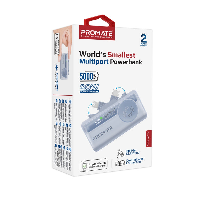 Promate raises the bar for compact portable power with the all-new PowerUp-Trio 5000mAh Mini Power Bank. Seamlessly integrating cutting-edge technology into a compact design, this pocket-sized powerhouse features a trio of charging options including a 20W USB-C™ In/Out foldable connector, 12W Lightning output foldable connector, plus a dedicated 2.5W Apple Watch charger on the front. Engineered for safety and reliability, it includes over-charging and over-heating protection. Its sleek metal kickstand doubles as a sturdy support for hands-free viewing. With a portable, mini form factor, versatile charging options and an intuitive LED display for battery monitoring, the Promate Mini Power Bank is your ultimate companion for staying charged, connected, and in control wherever you go.